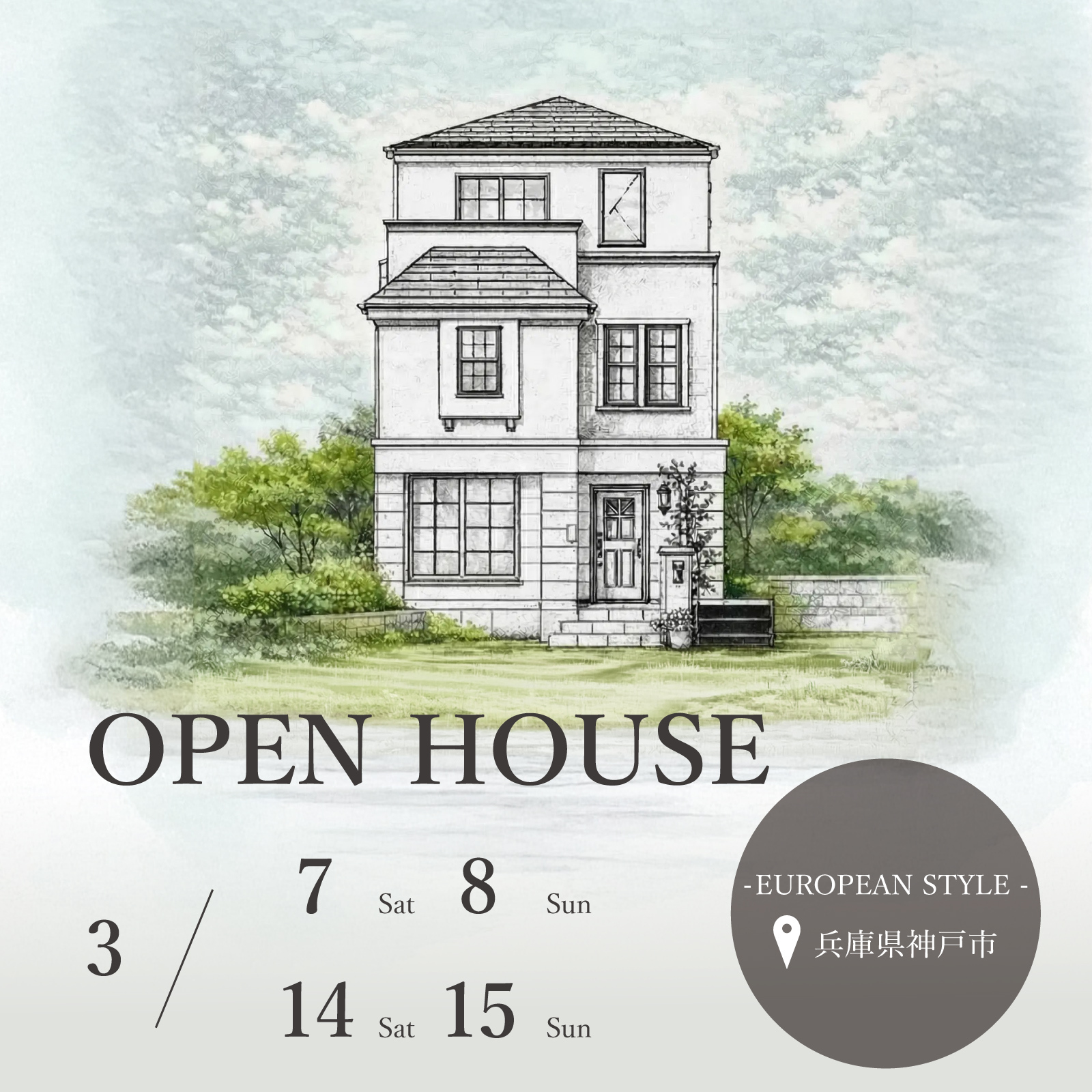 兵庫県神戸市にできたパリスタイルの完成見学会です。本気でこだわった海外デザインの住宅で、特に家族が一番大切にするLDKを2階に配置し、天井高は2.6mの大空間設計で建築しています。